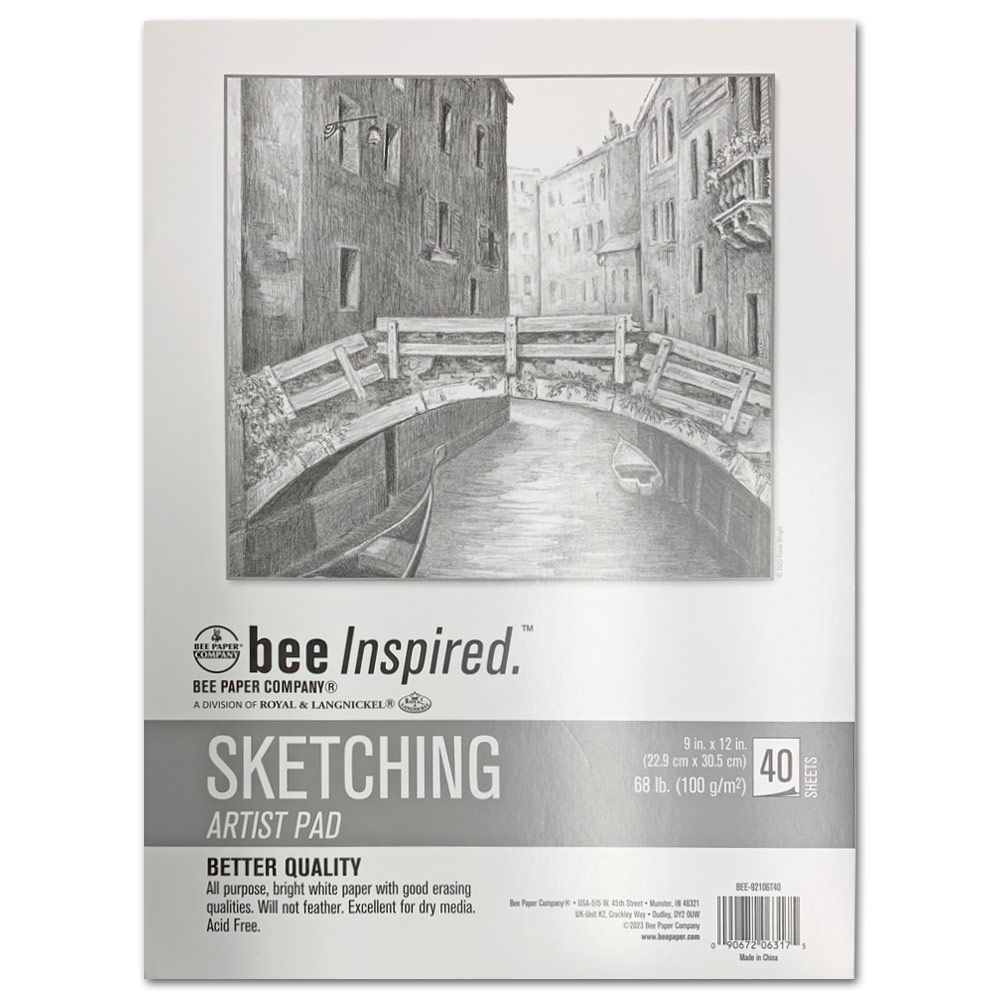 Bee Paper Company Bee Inspired. Sketching Artist Pad features a 40 sheet collection of 9" x 12" all purpose, acid-free, bright white 68lb paper. This paper has good erasing qualities and will not feather. Excellent for dry media.