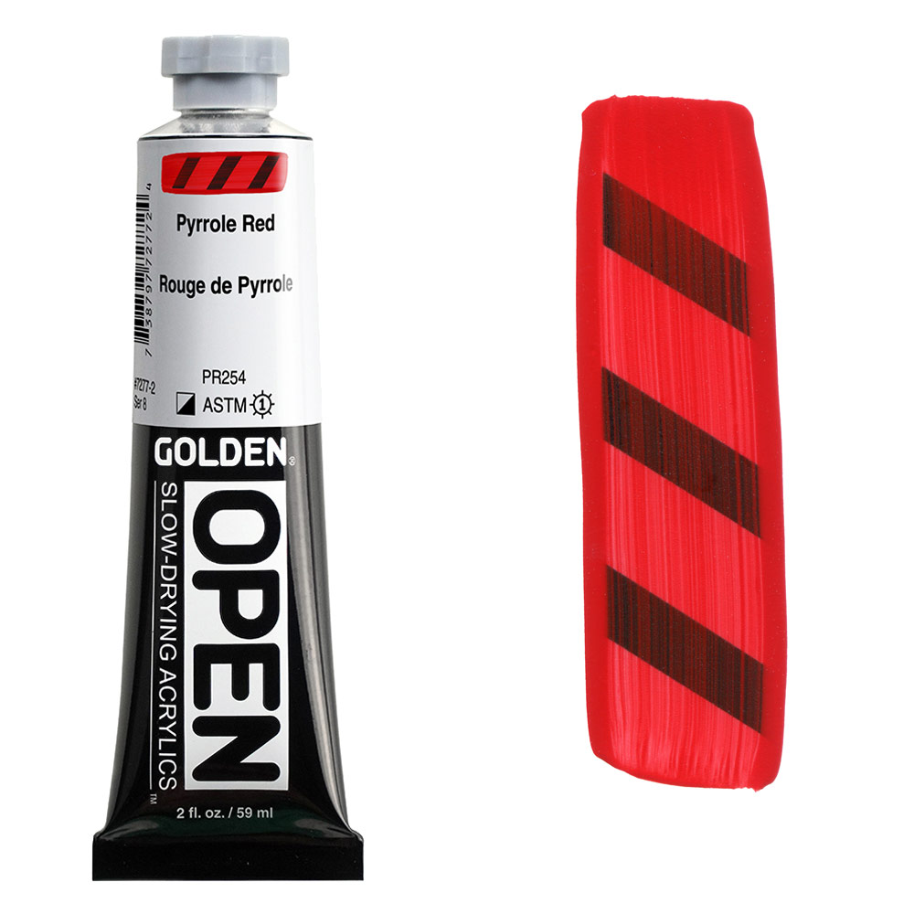 Golden OPEN Acrylics paint in Pyrrole Red (7277) is a semi-opaque, synthetic organic color with an excellent lightfastness and permanency. The pigment in Golden's Pyrrole Red, PR254, is also used in automotive finishes because it is exceptionally lightfast, and a very clean, bright red.