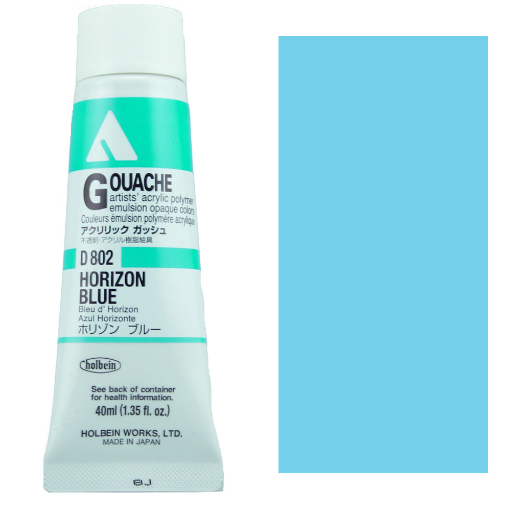 Holbein Acrylic Gouache paint in Horizon Blue (D802) is an opaque color with robust lightfastness.