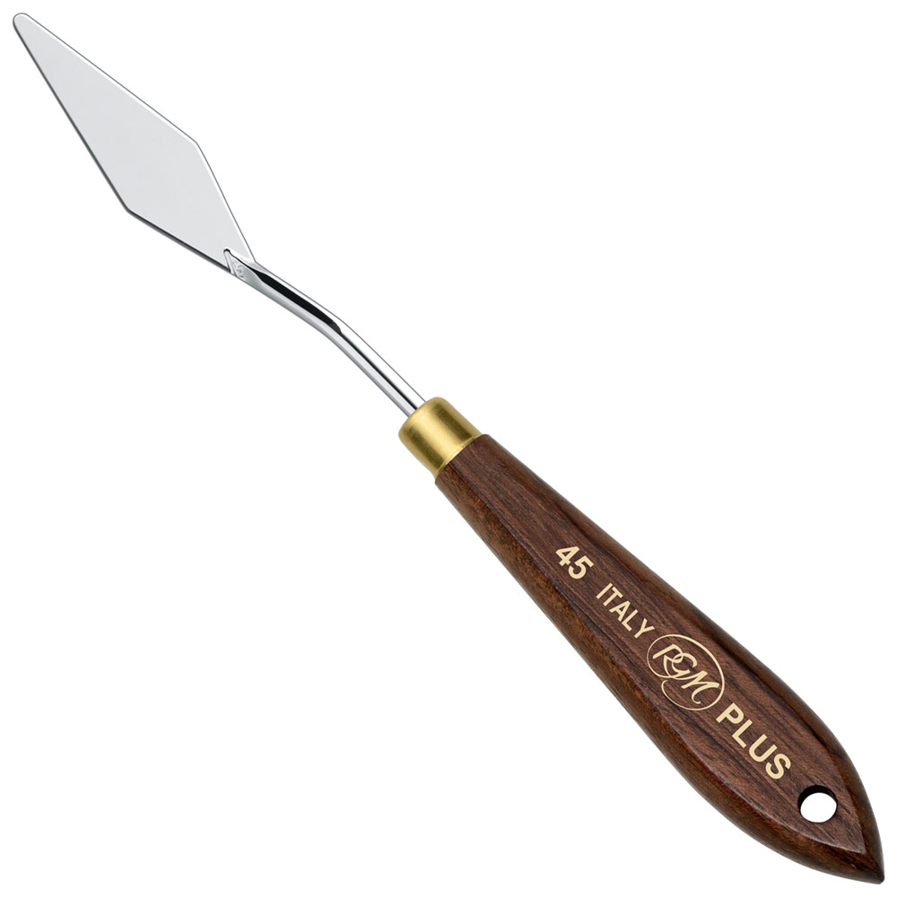 The RGM Plus Line is characterized by a special electrolytic protection which optimizes the functionality of the spatulas and the spreadability of the color, making it suitable for every need during painting. The ergonomic handle features solid brass ferrules and handsome bubinga wood handles. The blade is tempered and ground by hand to assure consistent flexibility and quality.